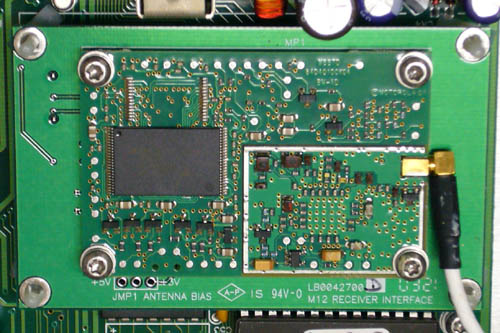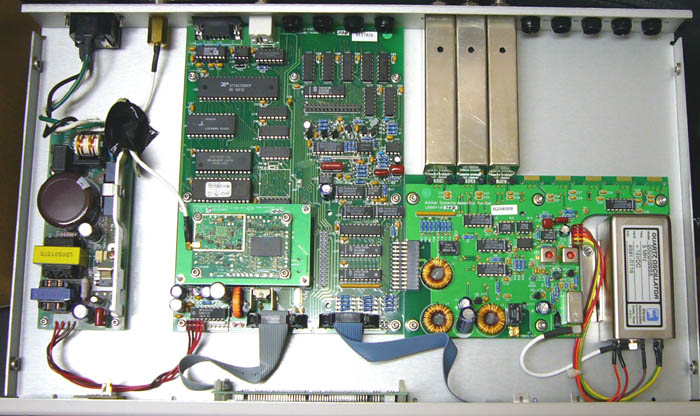すっきりとしている1083Bの内部 中央・左下寄りの小さな基板がGPS受信ユニット 右上が出力部 左のユニットから1,5,10MHz