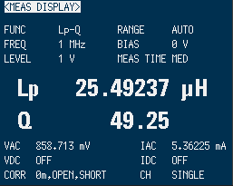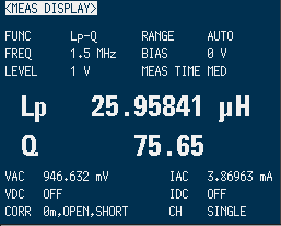 0.2mmUEW線を20m巻いてインダクタンスを実測しました。 40kHz時 11.944mH / Q:89 60kHz時 12.189mH /