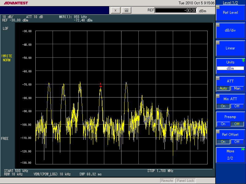 電界強度測定以外に、隣の会議室の調光装置と、通路にある自販機から中波帯に影響するノイズを確認しました。