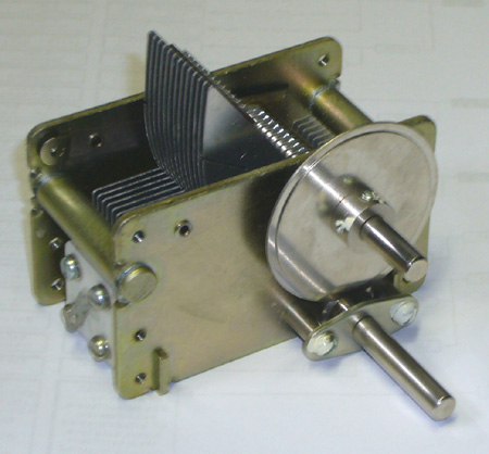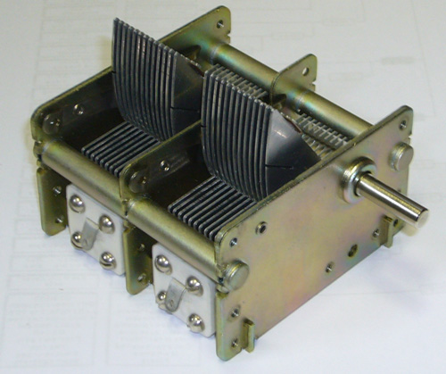 右下の4枚の円盤が同調用バリコンで、横には検波用ダイオードが取り付けられています。